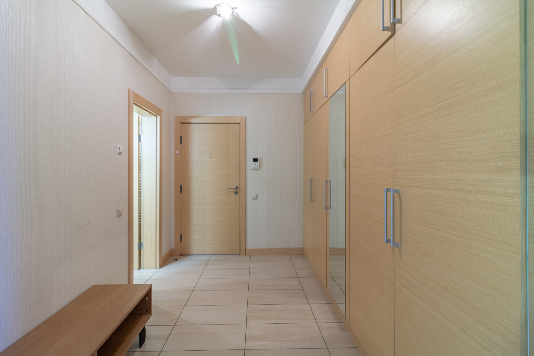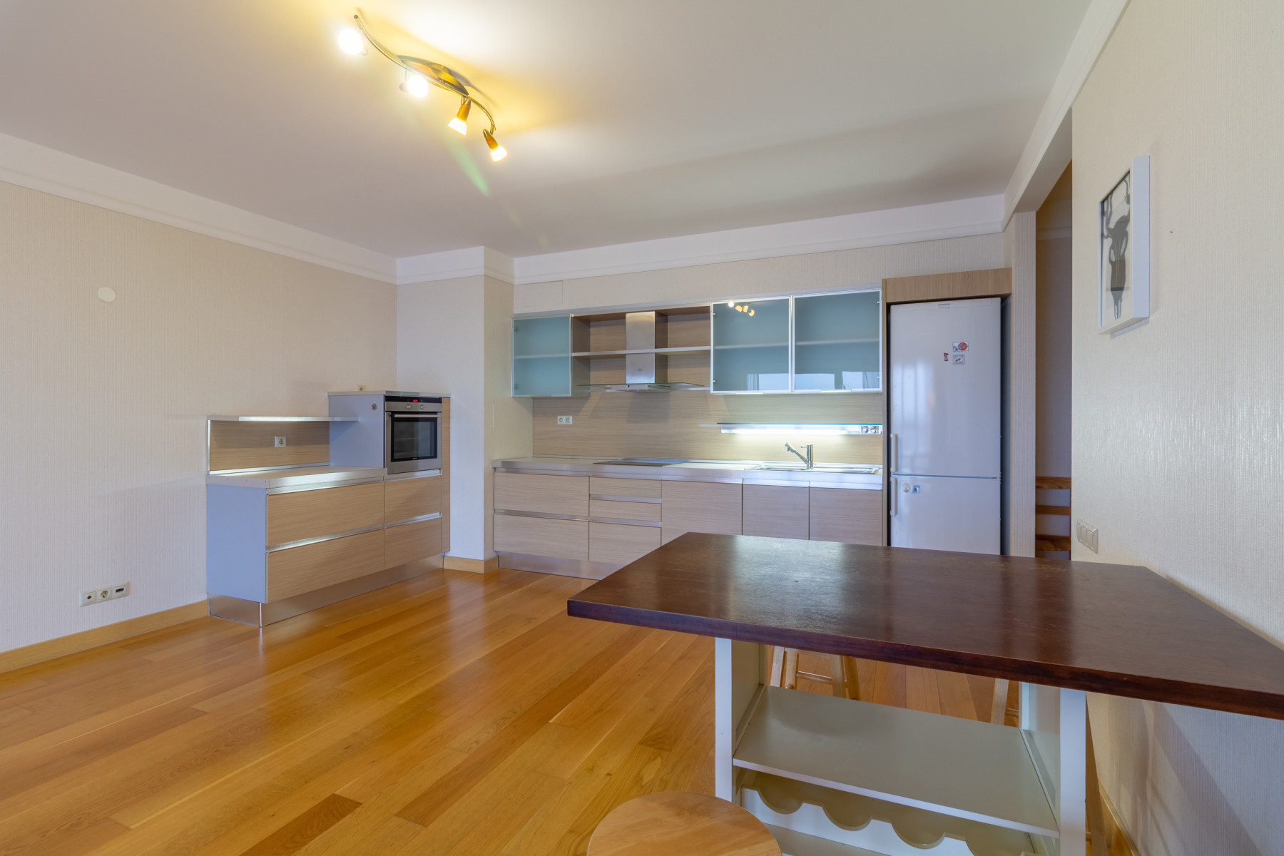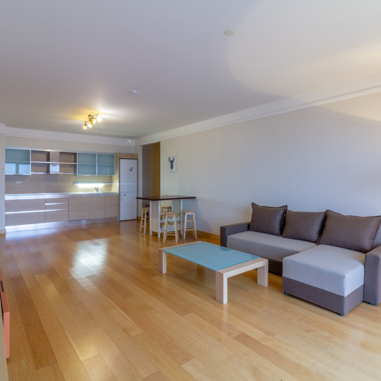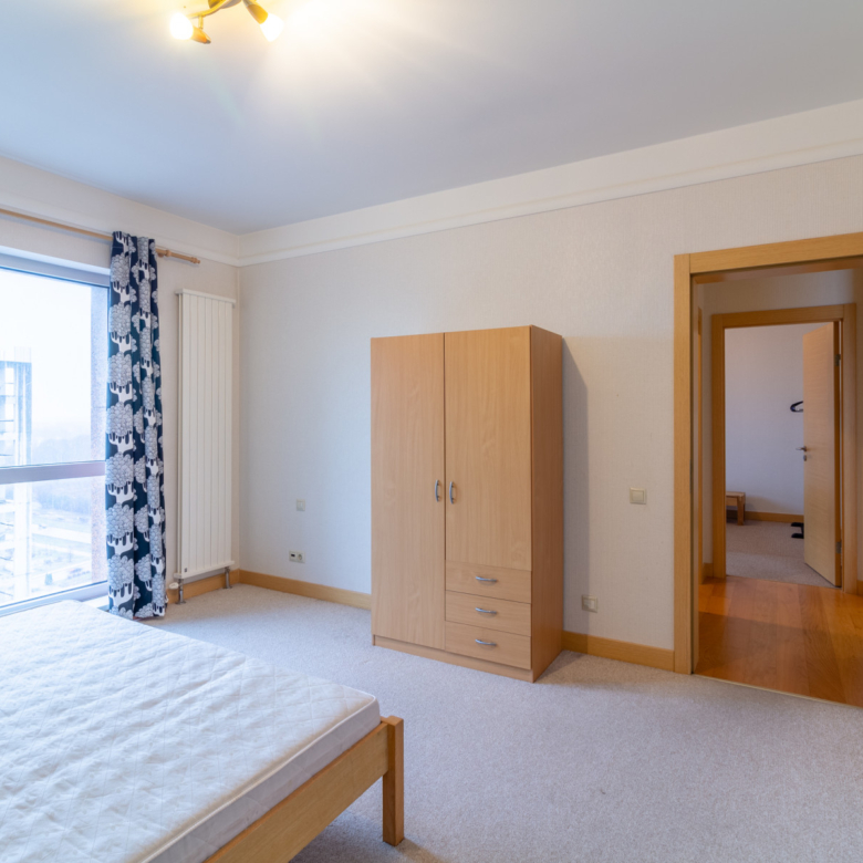 Trīsistabu dzīvoklis projektā Panorama Plaza. Dzīvoklis ar plašu viesistabu, kas apvienota ar virtuvi, divām guļamistabām un divām vannasistabām. Dzīvoklis aprīkots ar iebūvētu virtuvi – elektriskā cepeškrāsns, elektriskā plīts virsma, trauku mazgājamā mašīna un ledusskapis. Veļasmašīna novietota vienā no vannasistabām. Guļamistabās ir divguļamās gultas un drēbju skapji. Viesistabā ir pusdienu galds ar četriem krēsliem, dīvāns un žurnālgaldiņš. Mājā ir četri lifti, diennakts apsardze un videonovērošana. Papildus iespējams nomāt pazemes autostāvvietu. Ērta satiksme uz lidostu un pilsētas centru.